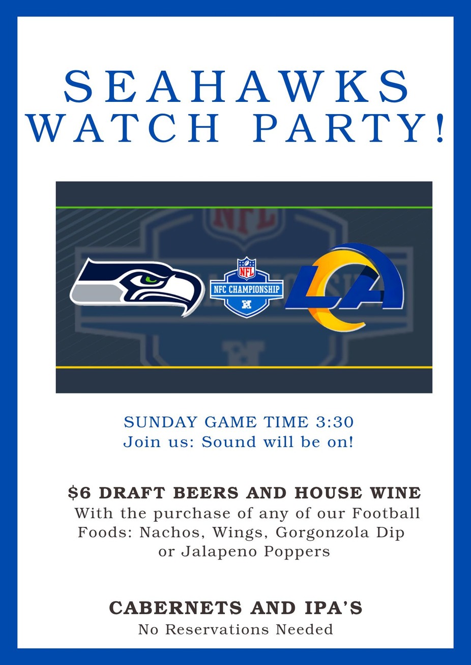 LET'S GO HAWKS!!! We hope to see you for $6 Beers and the Best Nachos around! No reservations needed just wear your Hawks gear and come in and cheeer the team on to The Superbowl!